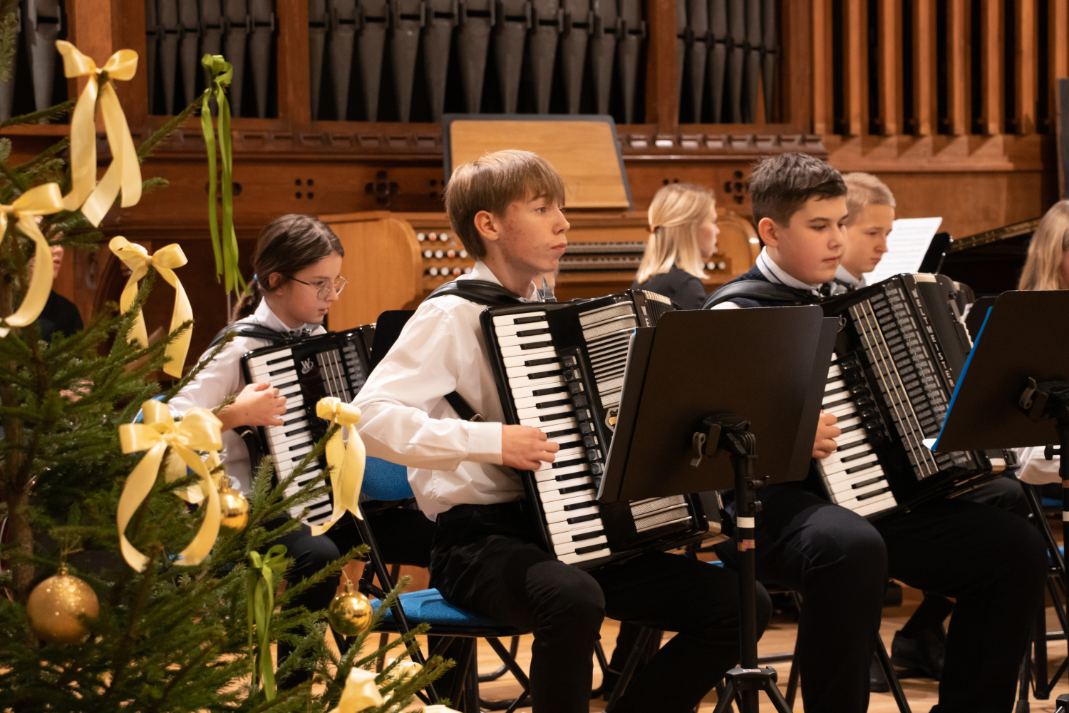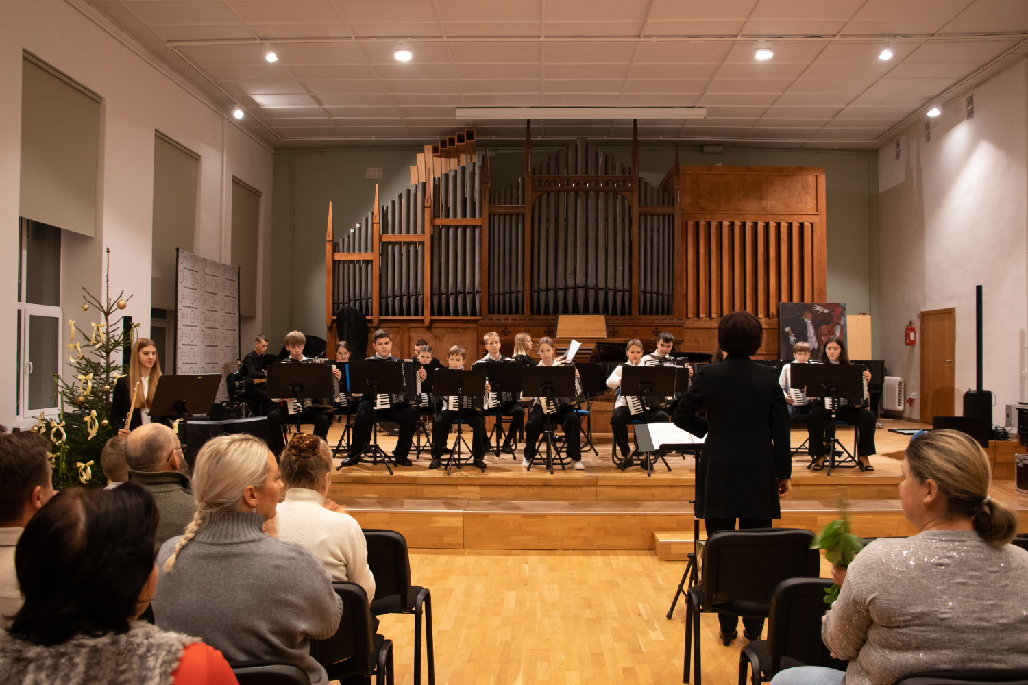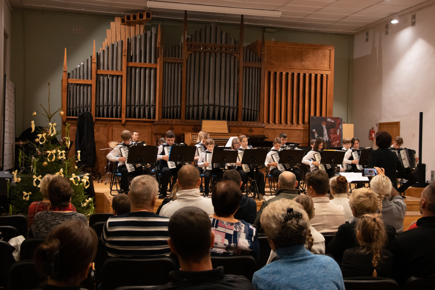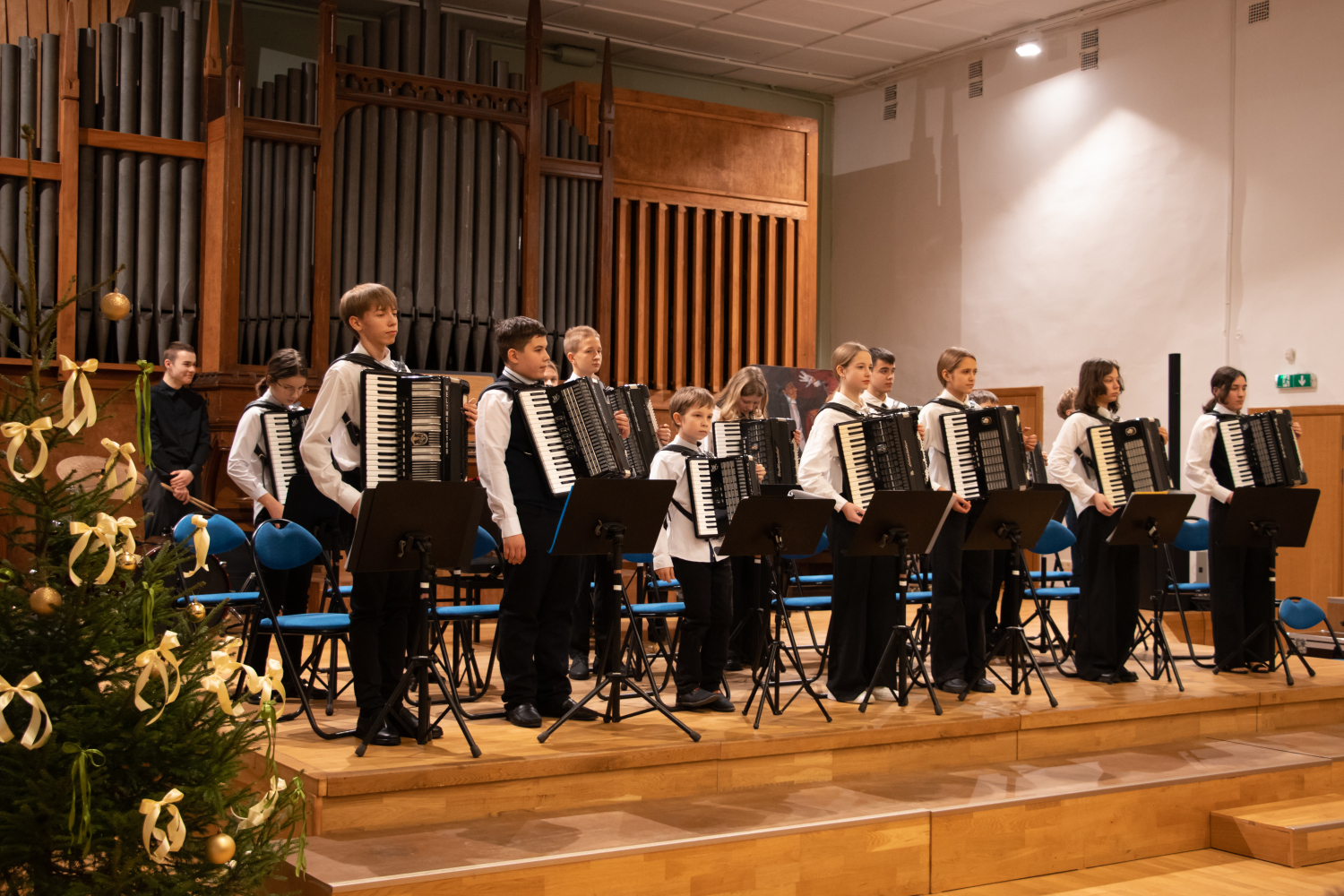 2024.gada 11.decembrī Mākslu izglītības kompetences centra "Latgales Mūzikas un mākslas vidusskola" struktūrvienības, Jāņa Ivanova Rēzeknes mūzikas skolas (JIRMS), izglītības programmas "Taustiņinstrumentu spēle – Akordeona spēle" izglītojamie un pedagogi priecēja izglītojamo vecākus Ziemassvētku ieskaņu koncertā JIRMS Lielajā zālē.