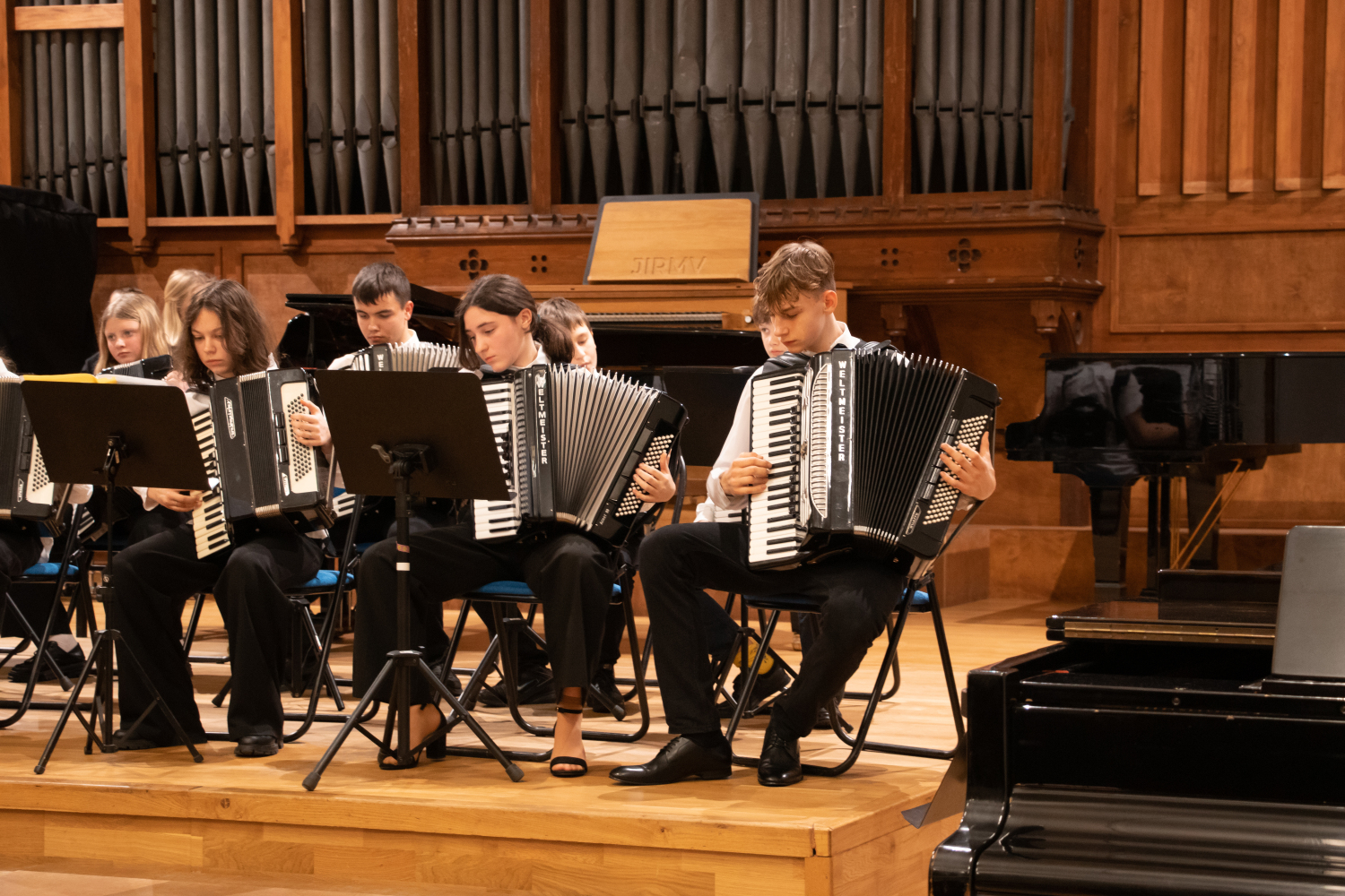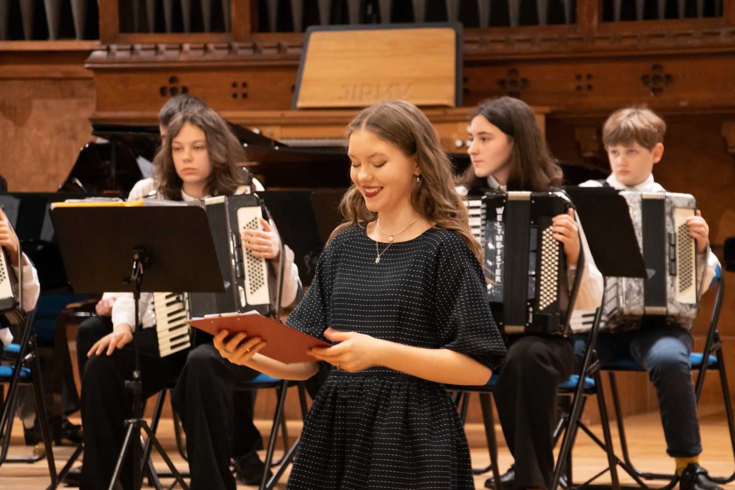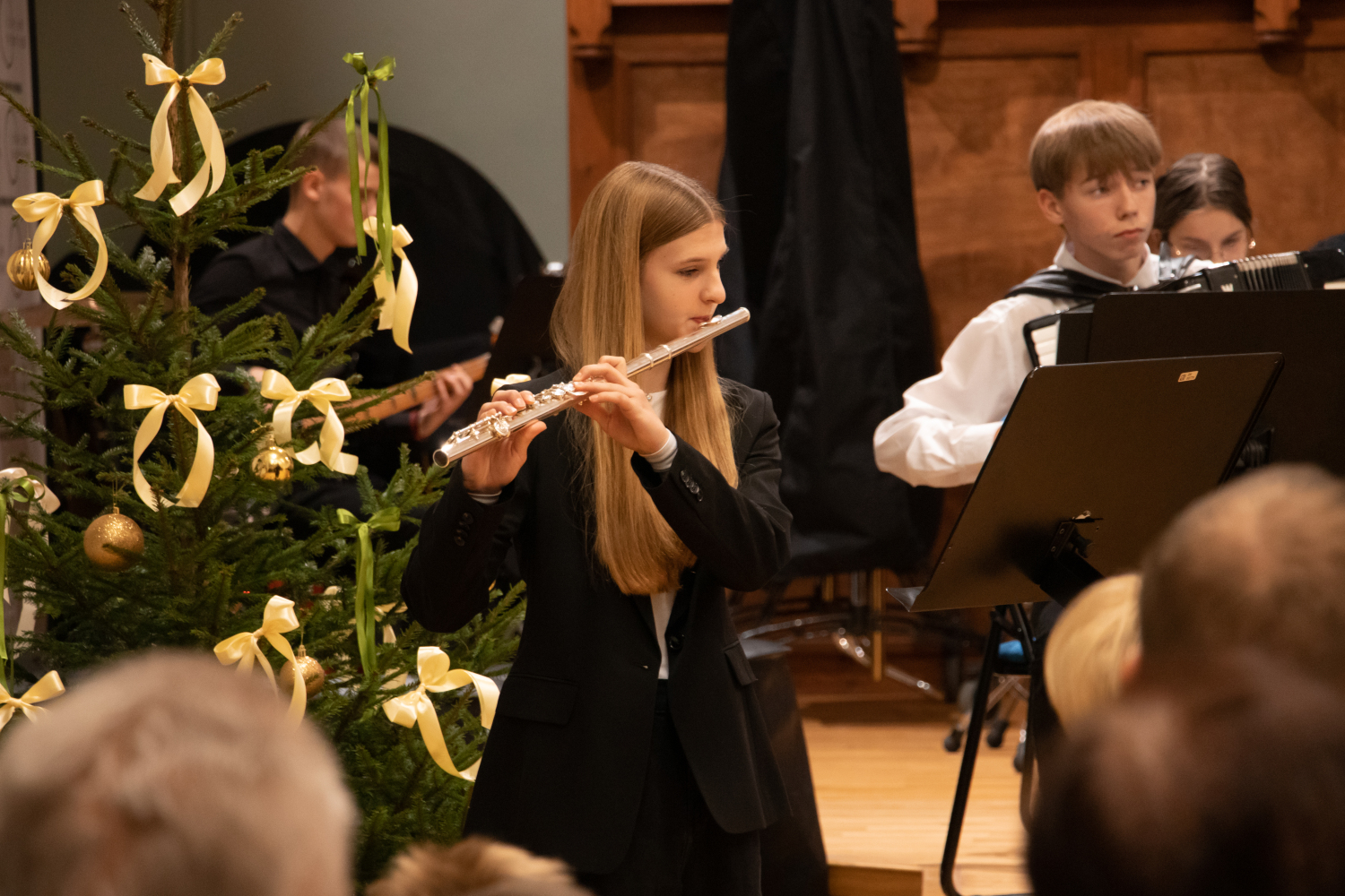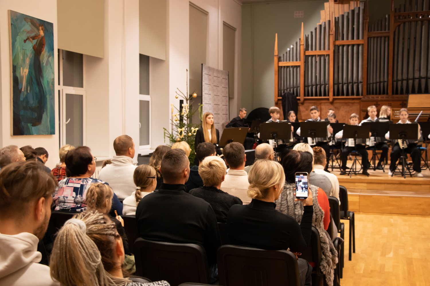 2024.gada 11.decembrī Mākslu izglītības kompetences centra "Latgales Mūzikas un mākslas vidusskola" struktūrvienības, Jāņa Ivanova Rēzeknes mūzikas skolas (JIRMS), izglītības programmas "Taustiņinstrumentu spēle – Akordeona spēle" izglītojamie un pedagogi priecēja izglītojamo vecākus Ziemassvētku ieskaņu koncertā JIRMS Lielajā zālē.