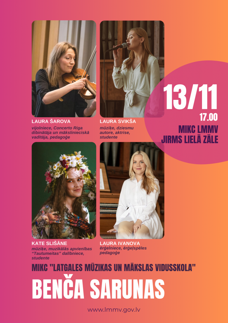 Pēc koncerta visus interesentus aicināsim uzkavēties un piedalīties sarunu vakarā “Benča sarunas”. Vakara galvenie viesi, kā ierasts, būs mūsu pašu JIRMS absolventi: IP Mūzika – Tradicionālā mūzika parstāve, mūziķe Kate Slišāne, IP Mūzika – Džeza un mūsdienu ritma mūzika pārstāve, džeza vokāliste Laura Svikša, IP Stīgu instrumentu spēle pārstāve, vijolniece Laura Šarova un IP Taustiņinstrumentu spēle pārstāve, ērģelniece un JIRMS ērģeļspēles pedagoģe Laura Ivanova. Ar katru no sarunu vakara galvenajām varonēm sīkāk iepazīstināsim vakara gaitā, un visiem dalībniekiem arī būs iespēja uzdot savus jautājumus. Atzīmēsim vien to, ka katra no varonēm ir spilgta personība, katrai no viņām ir savs interesantais stāsts, pieredze un skatījums uz to, kā mūzikas mākslas apgūšana ir ietekmējusi viņu dzīvi un turpmāko profesionālās karjeras attīstību. Būs patiesi vērtīgi un iedvesmojoši!