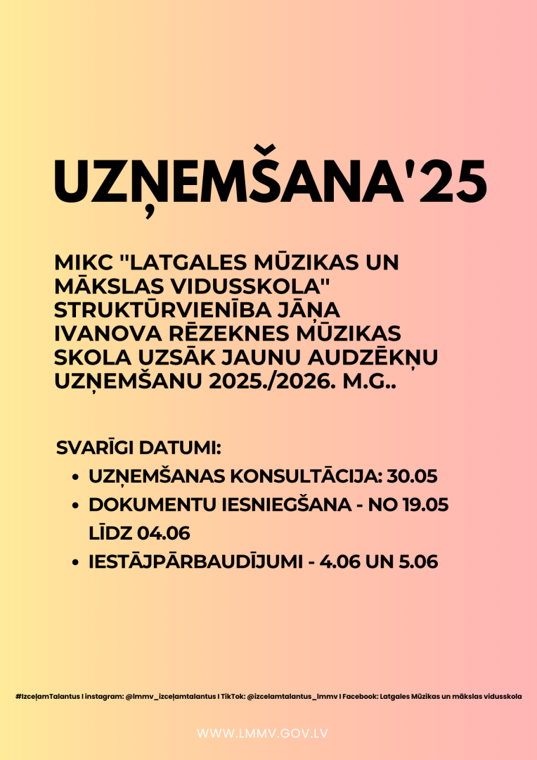 MIKC “Latgales Mūzikas un mākslas vidusskola” struktūrvienība “Jāņa Ivanova Rēzeknes mūzikas skola” izsludina 2025.gada uzņemšanas grafiku!