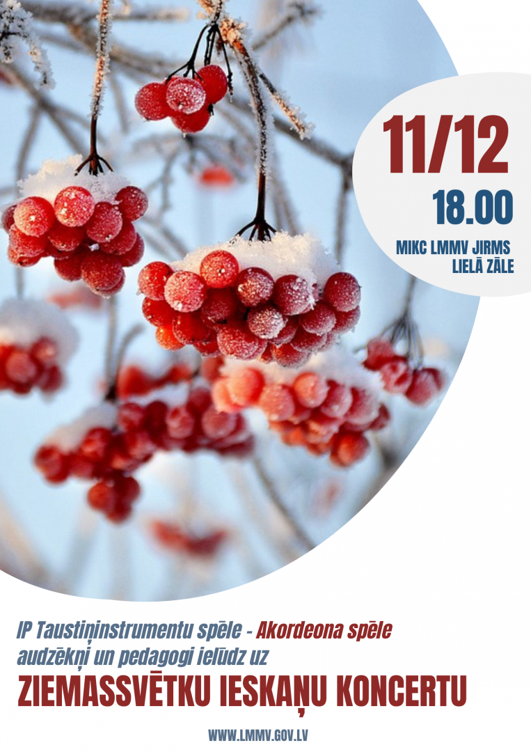11.decembrī plkst.18.00 MIKC LMMV JIRMS IP Taustiņinstrumentu spēle – Akordeona spēle izglītojamie un pedagogi ielūdz uz Ziemassvētku ieskaņu koncertu vecākiem.