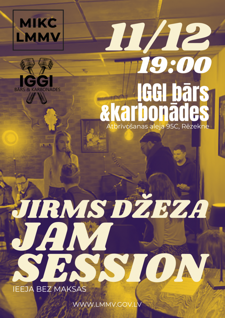 11.decembrī plkst.19.00 "IGGI bārs & karbonādes" notiks JIRMS Džeza Jam Session (džemsesija). Tajā improvizēs MIKC LMMV Jāņa Ivanova Rēzeknes mūzikas skolas IP Mūzika (Džeza un mūsdienu ritma mūzika) audzēkņi un pedagogi.