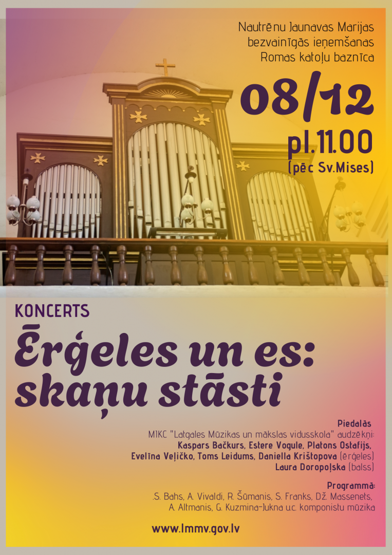8.decembrī plkst.11.00 (Pēc Sv. Mises) Nautrēnu Jaunavas Marijas bezvainīgās ieņemšanas Romas katoļu baznīcā aicinām uz koncertu “Ērģeles un es: skaņu stāsti”.