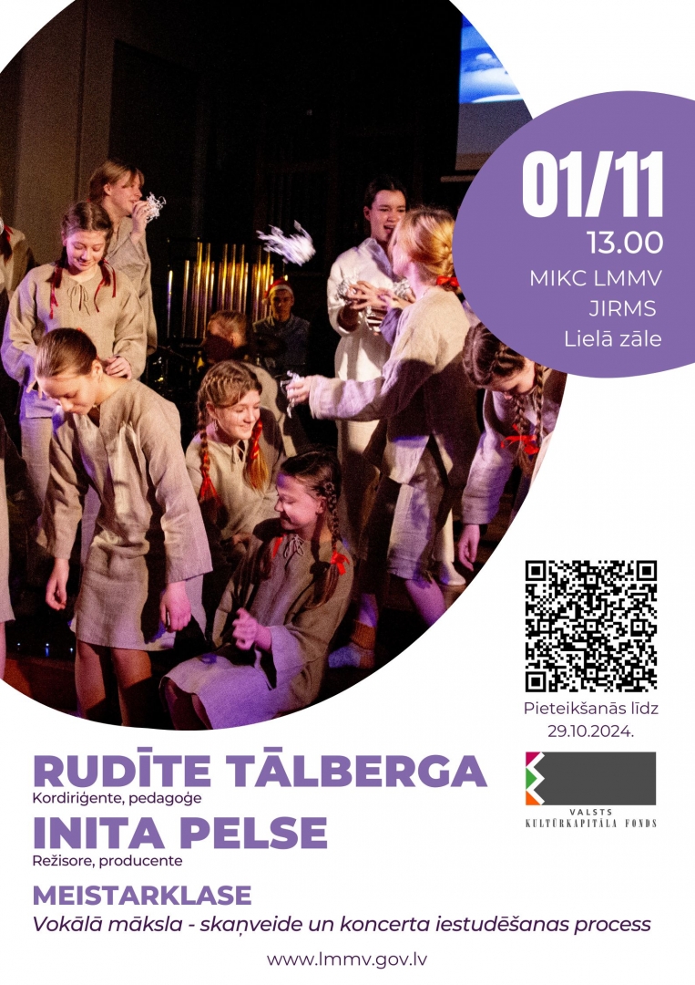 MIKC “Latgales Mūzikas un mākslas vidusskola” struktūrvienība "Jāņa Ivanova Rēzeknes mūzikas skola" aicina pieteikties kordiriģentes, pedagoģes Rudītes Tālbergas un režisores, producentes Initas Pelses meistarklasei “Vokālā māksla - skaņveide un koncerta iestudēšanas process”.
