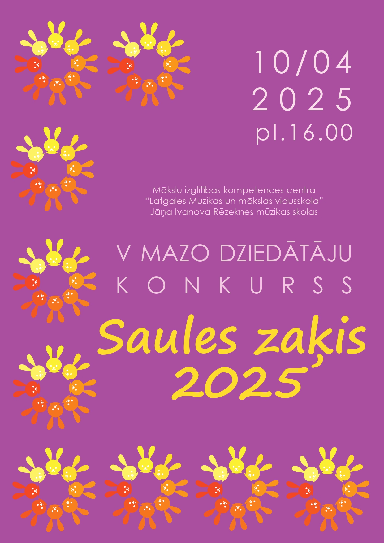 V Mazo dziedātāju konkurss “Saules zaķis” norisināsies 2025.gada 10.aprīlī plkst.16.00 MIKC “Latgales Mūzikas un mākslas vidusskola” struktūrvienībā “Jāņa Ivanova Rēzeknes mūzikas skola” (adrese: Atbrīvošanas aleja 56, Rēzekne).