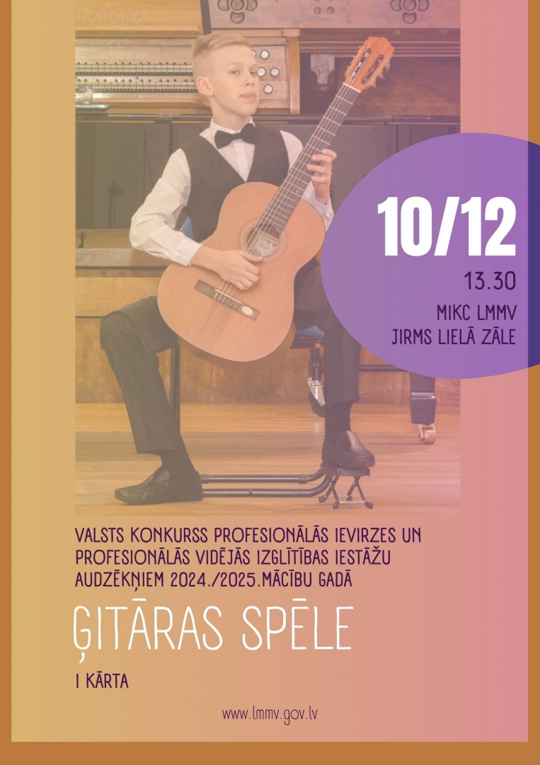 Valsts konkursa Latvijas profesionālās ievirzes un profesionālās vidējās izglītības iestāžu ģitāras spēles audzēkņiem I kārta norisināsies 10.decembrī pl.13.30 MIKC LMMV Jāņa Ivanova Rēzeknes mūzikas skolas Lielajā zālē.